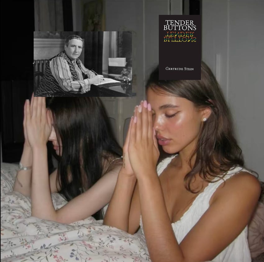 By no, why stop there? Splendor Buttons was going to be Gertrude Stein Reincarnate in Zine Form. Gertrude Stein Reincarnate in Zine Form was going to have thousands of Instagram followers, hundreds of entries to sort through for each upcoming issue, and eventually a podcast where I talk to other people about… oh I don’t know… something in between pop culture brain rot and Barthes Camera Lucida? I had five zines mapped out, but only two of them actually exist in our current corporeal reality — the other three are lost to the ether, which also means they are on their way to becoming something else.