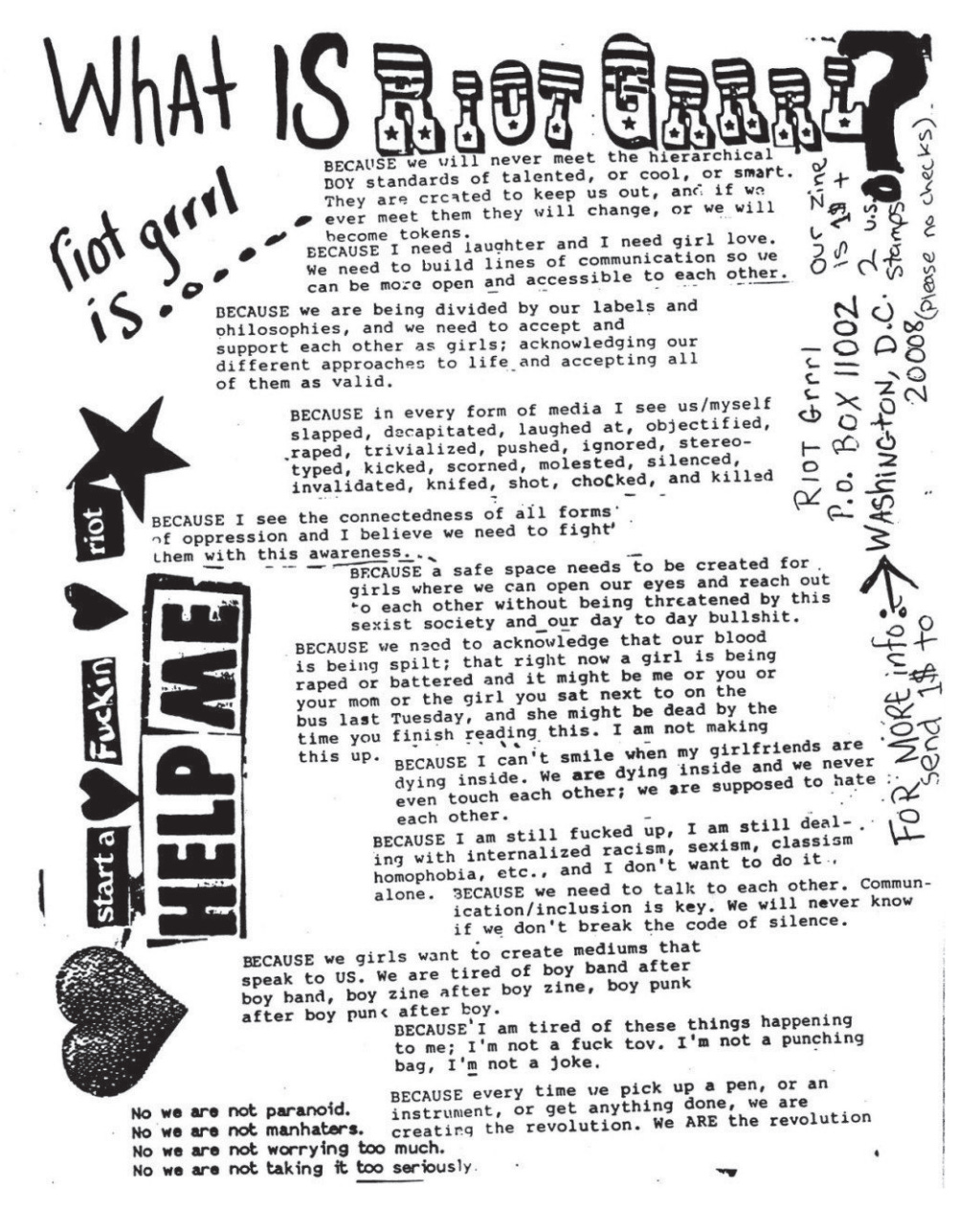 Again, back to function. What is the function of a zine? Zines originally functioned as a way to democratize information and generate community in a post-war pre-internet punk scene. Riot grrrls took them over in the 1990s, and zines functioned as a medium to empower young women to start producing their own work. They functioned as spaces for girls to engage with the music and the art they loved. This speaks to me deeply.